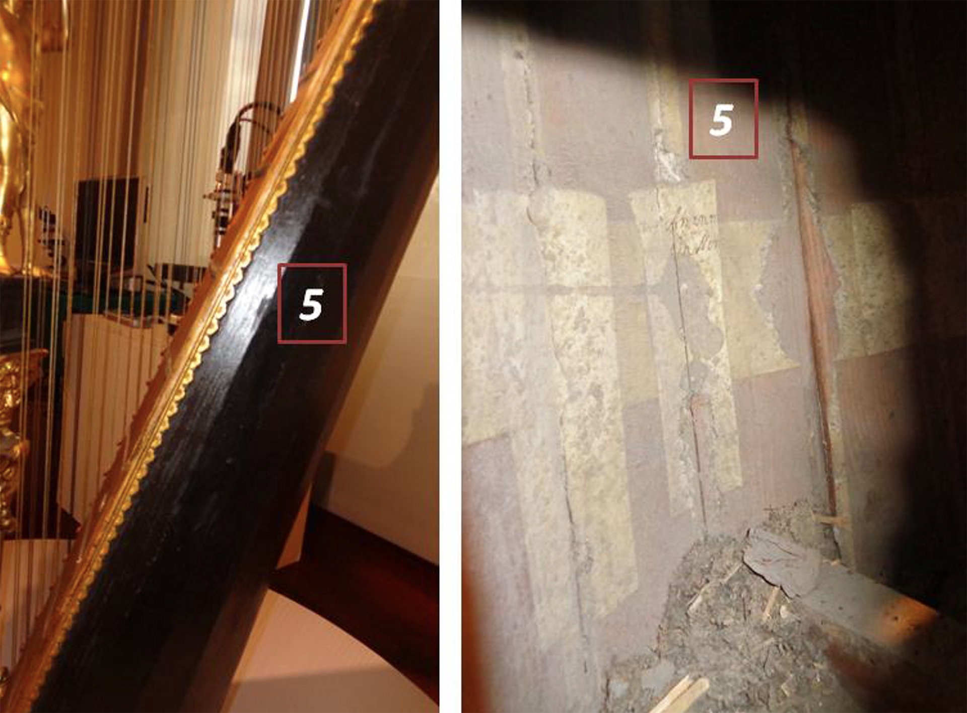 The body (5) of the Barberini Harp is also made of softwood—further examination was not possible at this point, as damage to the paintwork has over the centuries been thickly brushed over or retouched several times. An examination inside the instrument was not possible either.
